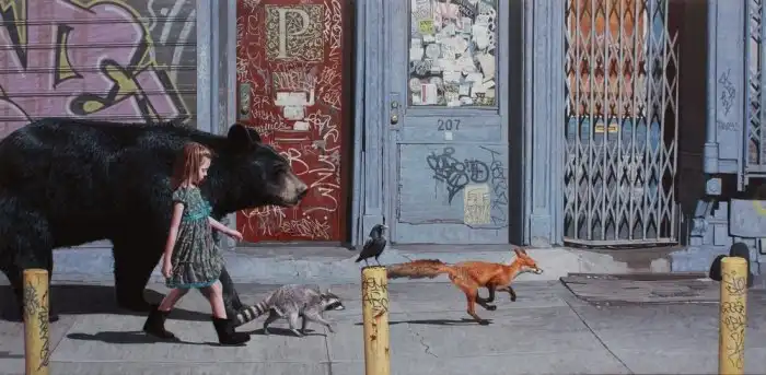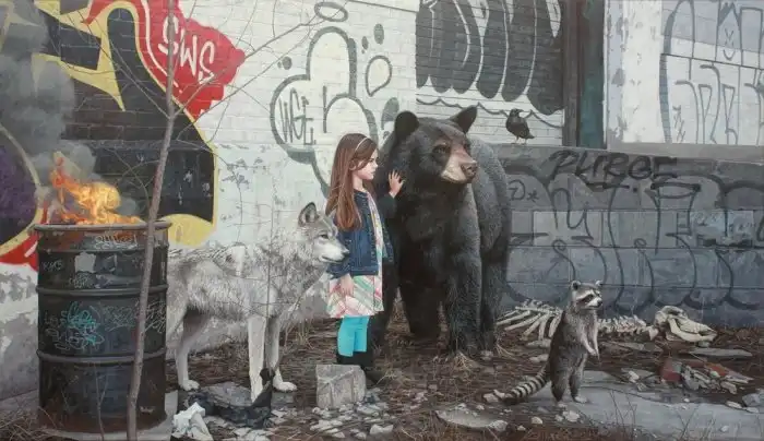 Художник Кевин Питерсон (Kevin Peterson) из Хьюстона рисует очень реалистичные рисунки детей и животных в разрушенных и полузаброшенных районах городов. Рисунки Кевина невероятно трогательны и создаются для того, чтобы мы поняли, как наша деятельность меняет окружающий нас мир, в то время как страдают от этого совершенно невинные создания.