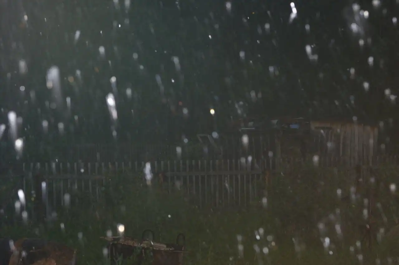 Пока ехали, выгружались, светило солнышко, но как только я сел в кресло, тут и жахнуло. Резко потемнело, поднялся ветер, сразу же началась дикая гроза, а минут через пять пошёл град. Сначала мелкий, потом всё крупнее и крупнее. Минут через 15 град закончился, ещё минут через 20 закончился и дождь, Полностью градины растаяли часа через три.