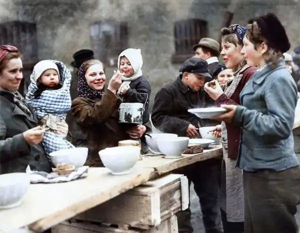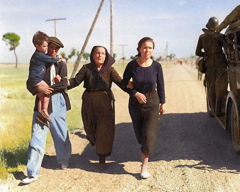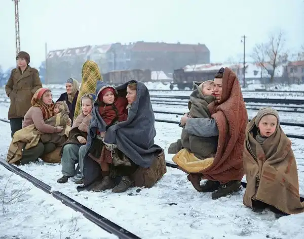 Эти фотографии недавно были раскрашены Санной Даллауэй, чтобы сделать впечатляющие кадры массового исхода европейского населения еще более яркими. Это напоминание о том, что надо принимать людей, нуждающихся в безопасности, раскрыть объятия таким же людям, как и мы.