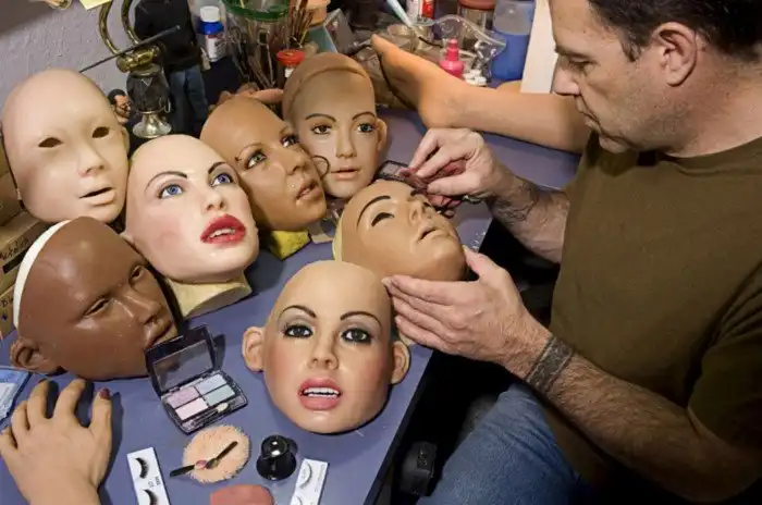 Дерек Транк в процессе нанесения косметики на лицо куклы.