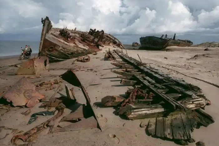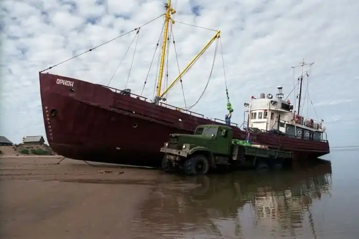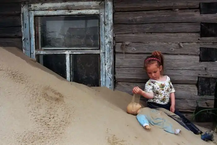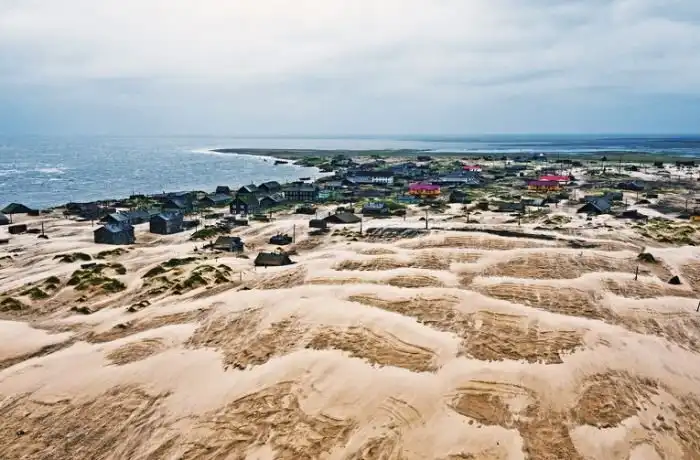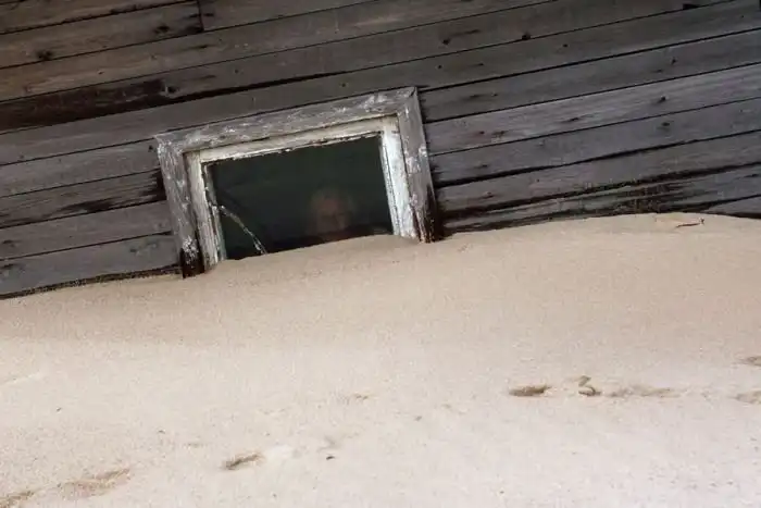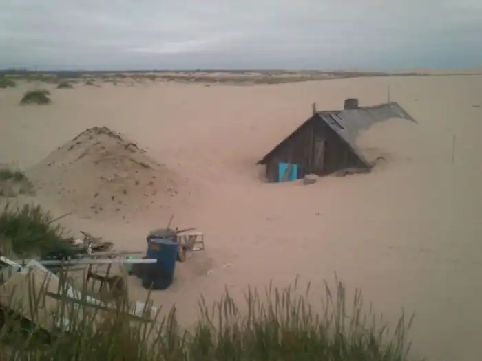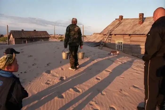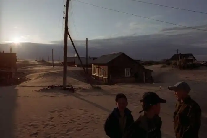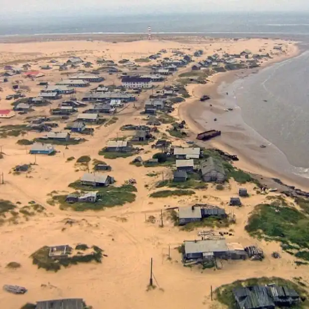 Далее предлагаем взглянуть на утопающее в песке село Шойна, что находится на берегу Белого моря в Ненецком автономном округе. Из-за того, что раньше рыбу здесь ловили тяжелыми тралами, растительность на дне моря была уничтожена и теперь намываемый морем песок превращается в высокие дюны, которые потом разрушаются под действием ветра, засыпая постройки. В селе нет почвы, передвигаться здесь можно только не вездеходах, а связь с миром происходит по воздуху.