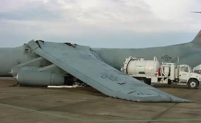Рзличного рода инциденты, произошедшие по глупости, свойственны не только нашей армии. На этих снимках поврежденный самолет Lockheed C-141 "Starlifter" ВВС США, который по глупости обслуживающего персонала аэропорта Мемфиса лишился крыла. Произошло это 20 декабря 2001 года, когда самолет готовили к вылету на авиабазу в Германии. Обнаружив утечку во втором баке, заправщики заполнили бак сжатым воздухом, чтобы по звуку определить место утечки. После того, как пробоина была найдена, ее залатали, однако воздух из бака выпустить забыли. Само собой, в момент заправки бак не выдержал напряжения и лопнул, снеся при этом еще и силовую конструкцию крыла.