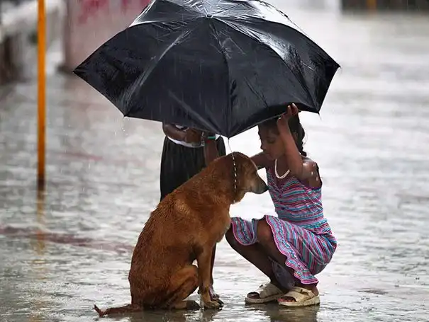 10. Девочка прячет бродячего пса под зонтиком во время муссонных дождей в Мумбаи