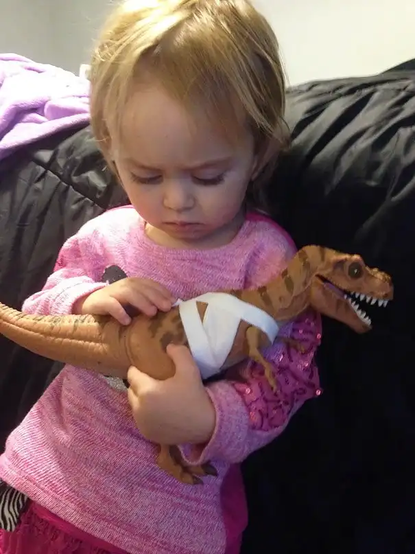 45. Двухлетняя девочка перевязала «раны» динозавра и теперь утешает его