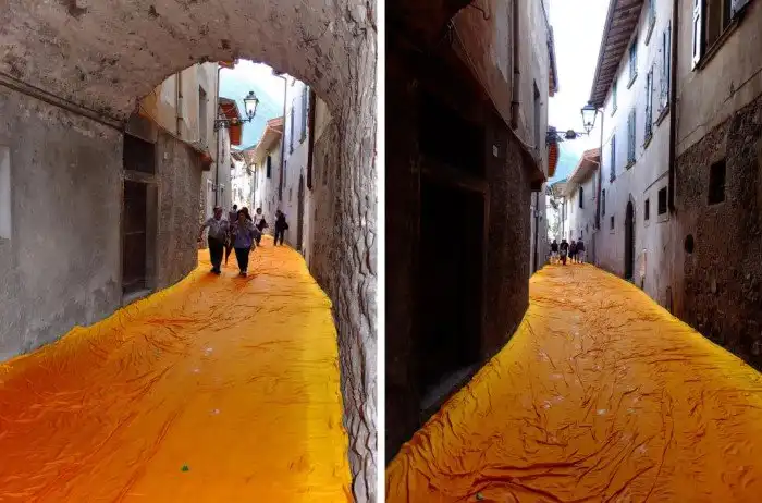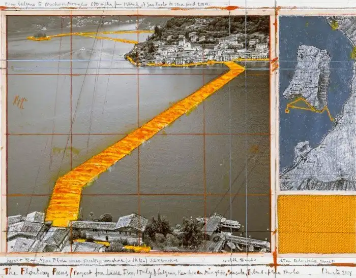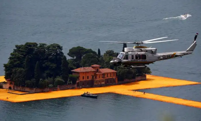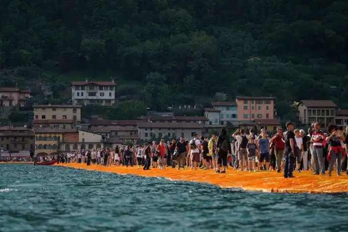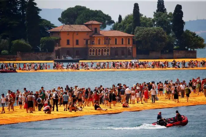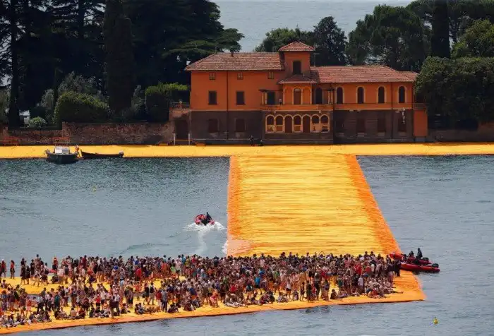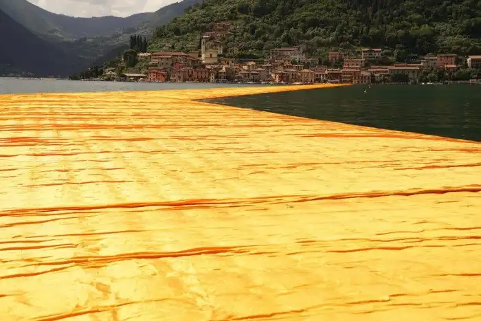 На севере Италии по озеру Изео проложили желтые плавучие пешеходные дорожки. Инсталляция «Плавучий пирс Христо», по задумке художников, позволяет ходить прямо по поверхности озера.