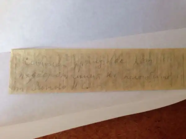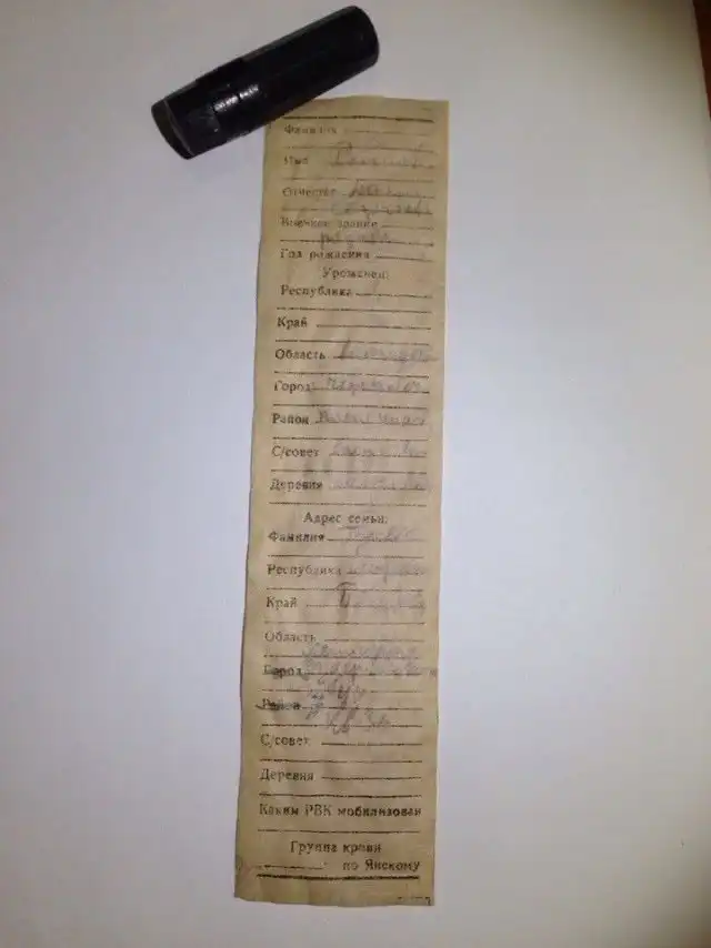 В Кировском районе Ленинградской области поисковики обнаружили останки красноармейца, при котом был найден жетон военнослужащего («смертный медальон»). Благодаря записке в медальоне была установлена личность бойца: Рыжов Ник… Сергеевич, уроженец Шекснинского р-на, Васильевского с/с, д. Полежаева. В графе «адрес семьи» было указано: Гусева Лизавета Петровна, г. Ленинград, ул. Дзержинского, д.44, кв. 36. На обратной стороне записки обнаружено обращение погибшего солдата, пролежавшее в земле 74 года.