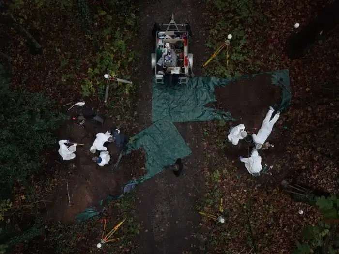 После извлечения останков место захоронения тщательно фотографируется и документируется. Белые шары — геотеги для 3D-сканера.