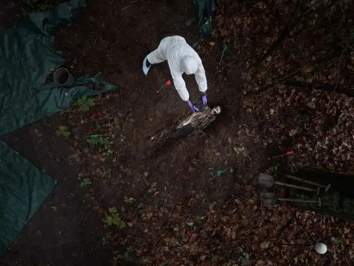 Чтобы не оставить следов на месте преступления, криминалисты используют пластиковые подставки. Тело жертвы исследуют при помощи портативного 3D-сканера.