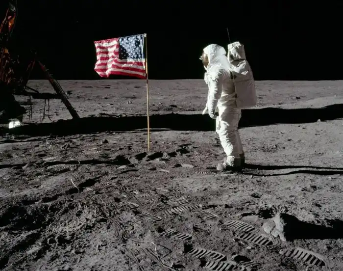 Базз Олдрин приветствует развернутый флаг США. Снимок сделан Нилом Армстронгом на 70 мм Hasselblad