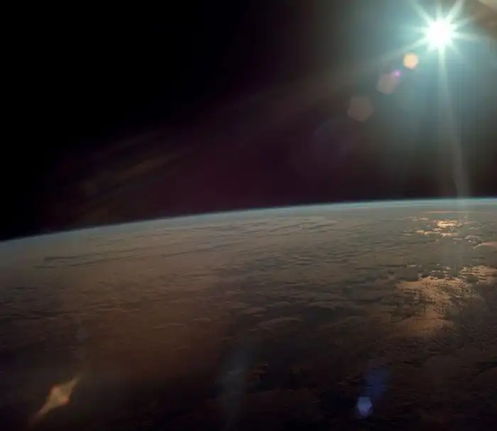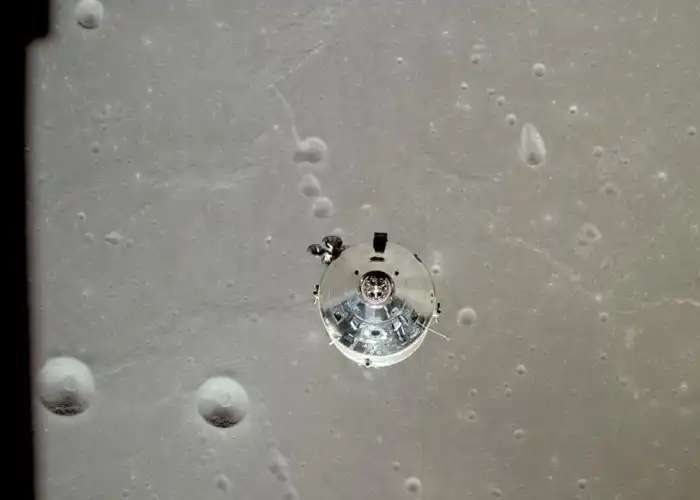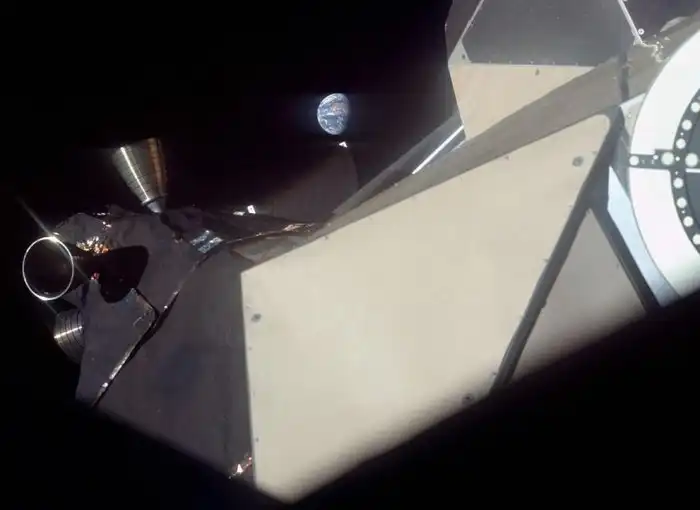 Вид лунного модуля и Земли во время трехдневного полета до Луны