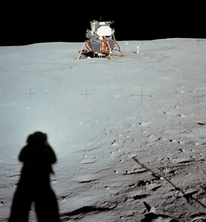 Астронавт Базз Олдрин прогуливается по Луне недалеко от модуля "Орел"