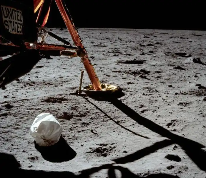 Мемориальная капсула гласит: "Здесь люди с планеты Земля, впервые ступившие на Луну, июль 1969 года н.э. Мы пришли с миром для всего человечества"