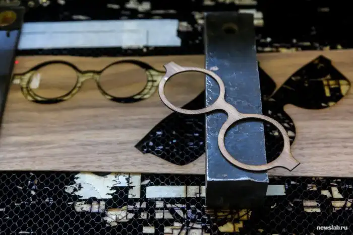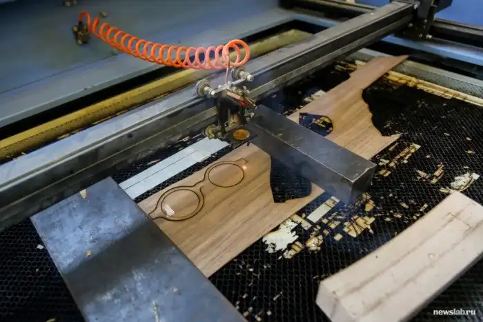 После того, как готовы чертежи, начинается производство. Оправы делают из шпона — тонких листов древесины ангарской сосны, березы, других пород дерева, вырезая лазером нужную форму.
