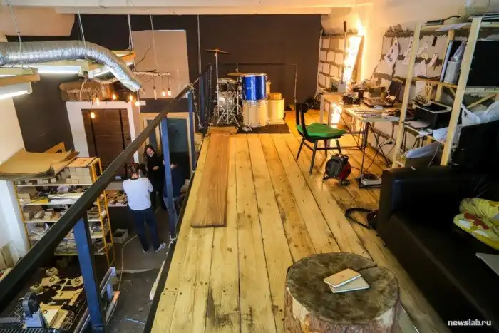 Мастерская разделена на два этажа: на первом — производственное пространство, на втором — офисное и зона отдыха.