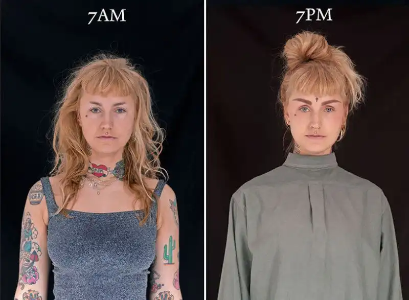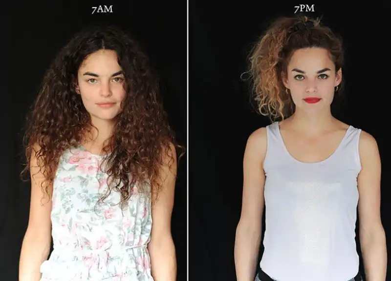 Именно эту разницу выбрала бельгийский фотограф Барбара Ивейнс главной темой своего фотопроекта «7 утра — 7 вечера». Барбара захотела показать происходящую с человеком метаморфозу за 24 часа. Странно, но мы, к примеру, заметили, что некоторые люди выглядят гораздо лучше, когда только встали с постели. А вы что думаете?