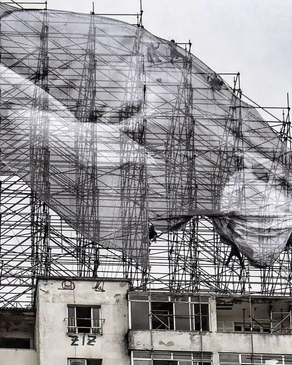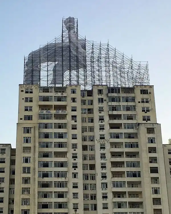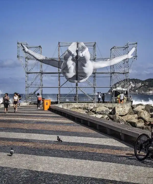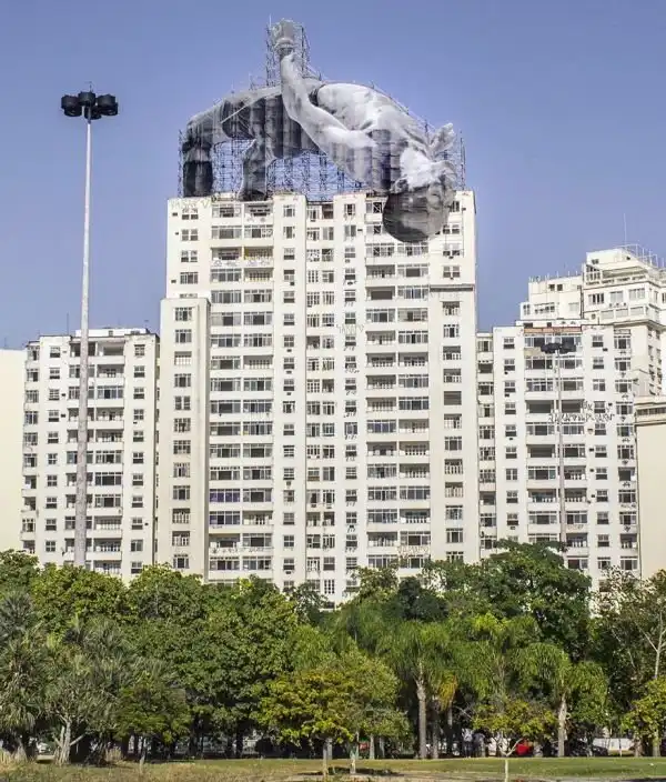 Французский уличный художник, известный под псевдонимом JR, решил украсить строительные леса, оставшиеся в Рио-де-Жанейро, и использовал для этого изображения спортсменов. На гигантских полотнах изображен прыгун в высоту и пловец в момент погружения в воду.