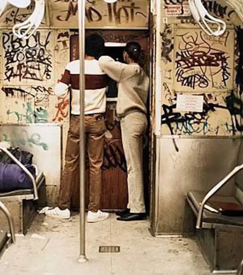 Так выглядела нью-йоркская подземка 80-х годов. Примерно в то же время социологи Уилсон и Келлинг сформулировали знаменитую теорию разбитых окон: «Если в здании разбито одно стекло, и никто его не заменяет, то через некоторое время в этом здании не останется ни одного целого окна». Применять ее в жизни начал мэр NY Джулиани в начале 90-х, начав именно с подземки.