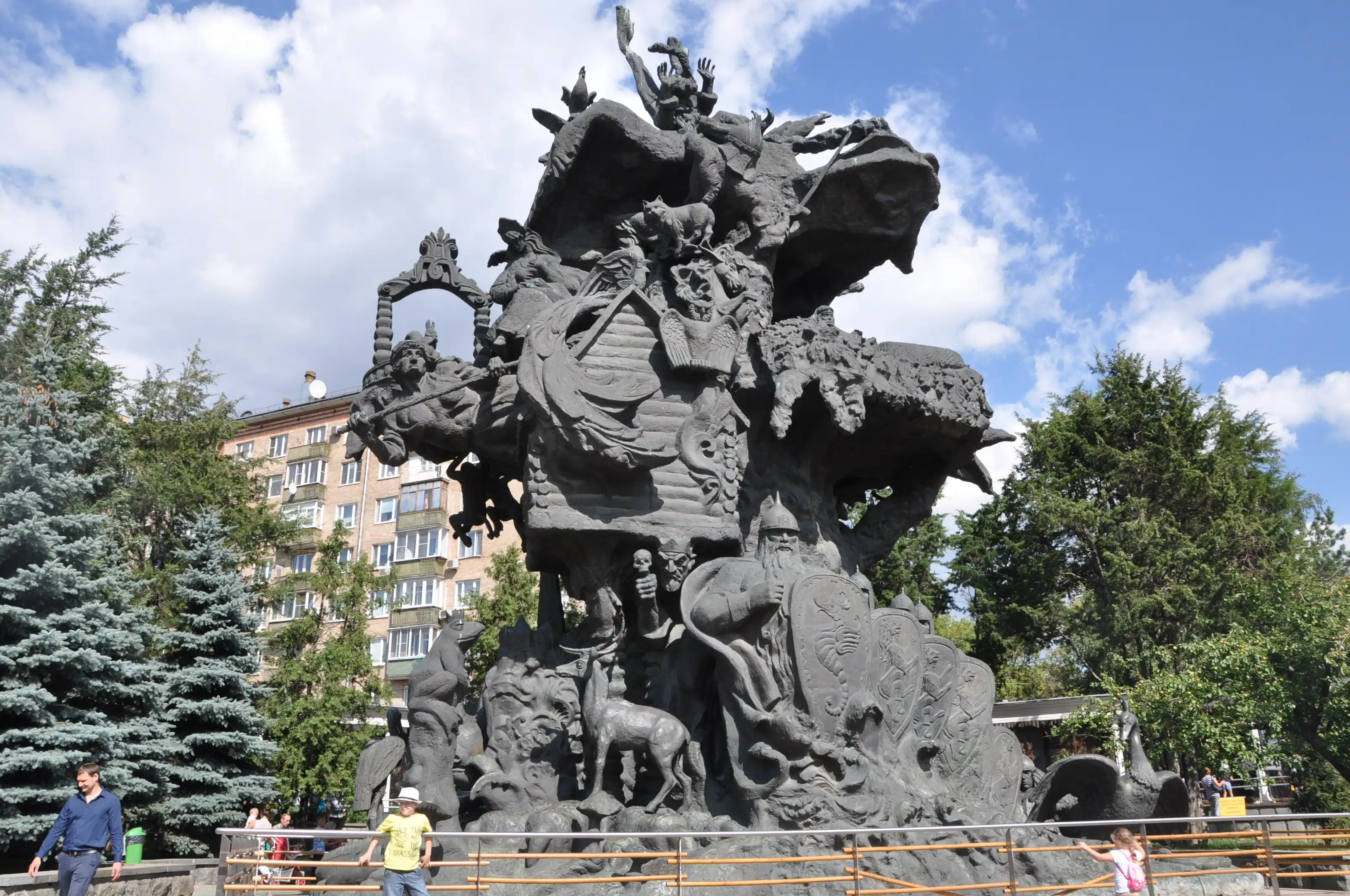 А это скульптурная композиция, посвящённая Русским сказкам и животным в них.