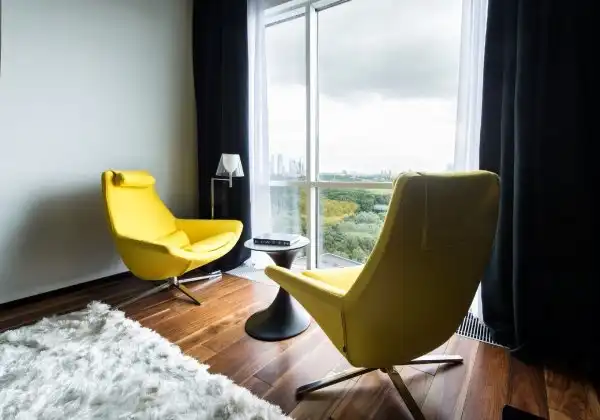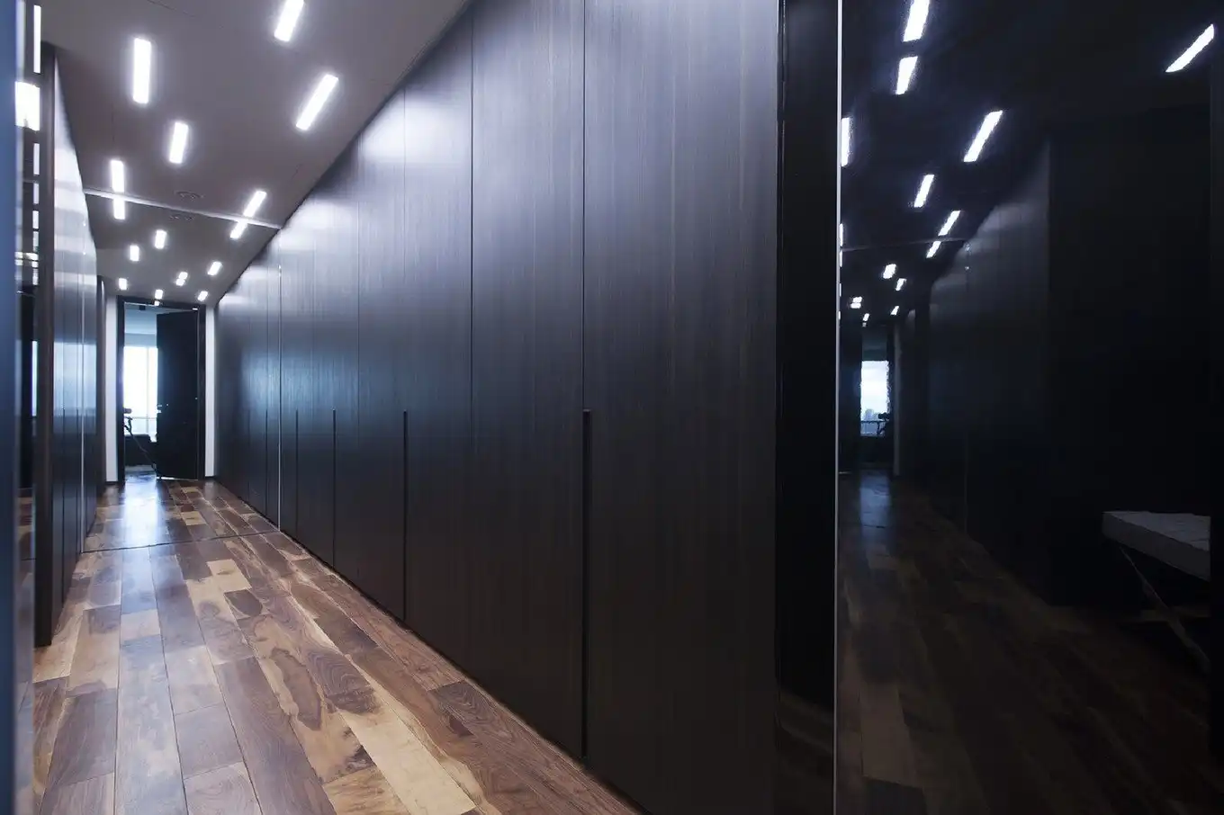Приватная зона состоит из двух спален, санузла и кабинета. Панорамные окна с видом на город располагают к тому, что удобно устроиться в кресле с чашечкой кофе. В основной спальне кровать, тумбочки и кожаные панели на стене выполнены по эскизам авторов проекта. За тонированным зеркалом расположен гардероб. В кабинете стена за рабочим столом отделана камнем со встроенными световыми профилями.
