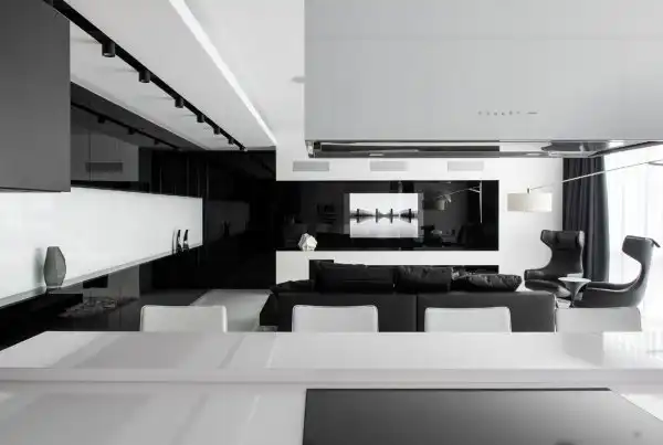 В прихожей за зеркальными панелями спрятана система хранения, а узор камня благодаря зеркалу складывается в элегантную бабочку. Гостиная совмещена с кухней и столовой, за счёт чего удалось сохранить масштаб помещения. Стена слева разделена на 3 зоны: за чёрными стёклами снизу и сверху скрываются полки, белая часть служит декоративным фоном. Зона домашнего кинотеатра – иллюзия! Телевизор встроен за чёрным стеклом, и при включении вся стена играет роль чёрно-белой архитектурной композиции. От приватной зоны гостиную отделяет стеклянная чёрная дверь, которая завершает образ пространства. Кухня логично отделена от гостиной барной зоной. Фасады из hpl-пластика отлично контрастируют с натуральным чёрным мрамором.