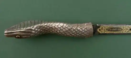 Серебряная рукоять выполнена в виде передней части туловища и головы ядовитой змеи с глазами-вставками из розового стекла.