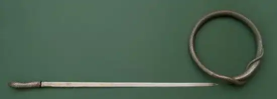 Серебряные ножны изготовлены в виде туловища с хвостом свернувшейся в кольцо змеи.