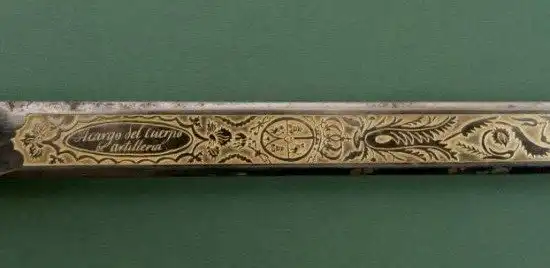 Клинок исключительной гибкости, стальной двулезвийный, без долов. Острие клинка расположено на средней линии. В верхней половине клинок с обеих сторон украшен травлением и золочением — растительный орнамент. С одной стороны в картуше вырезана надпись: Fca de Toledo 1846.