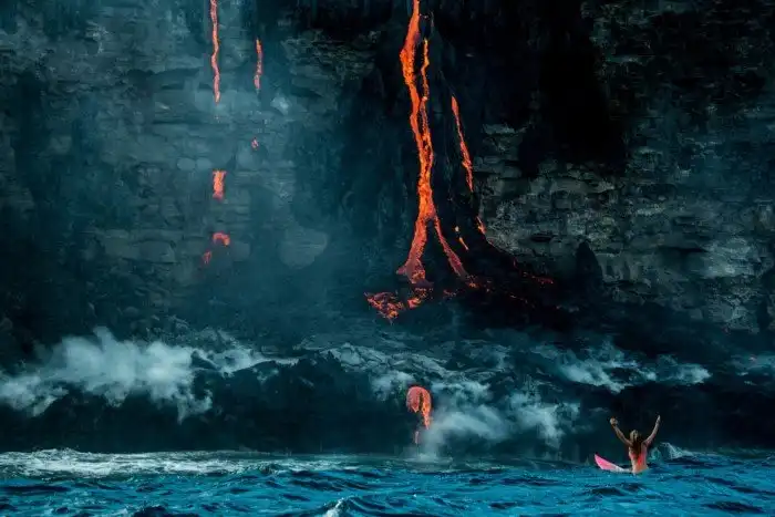 Сегодня в объективе удивительные кадры экстремального серфинга от профессиональной спортсменки Alison Teal. Недалеко от лавы, стекающей в океан.