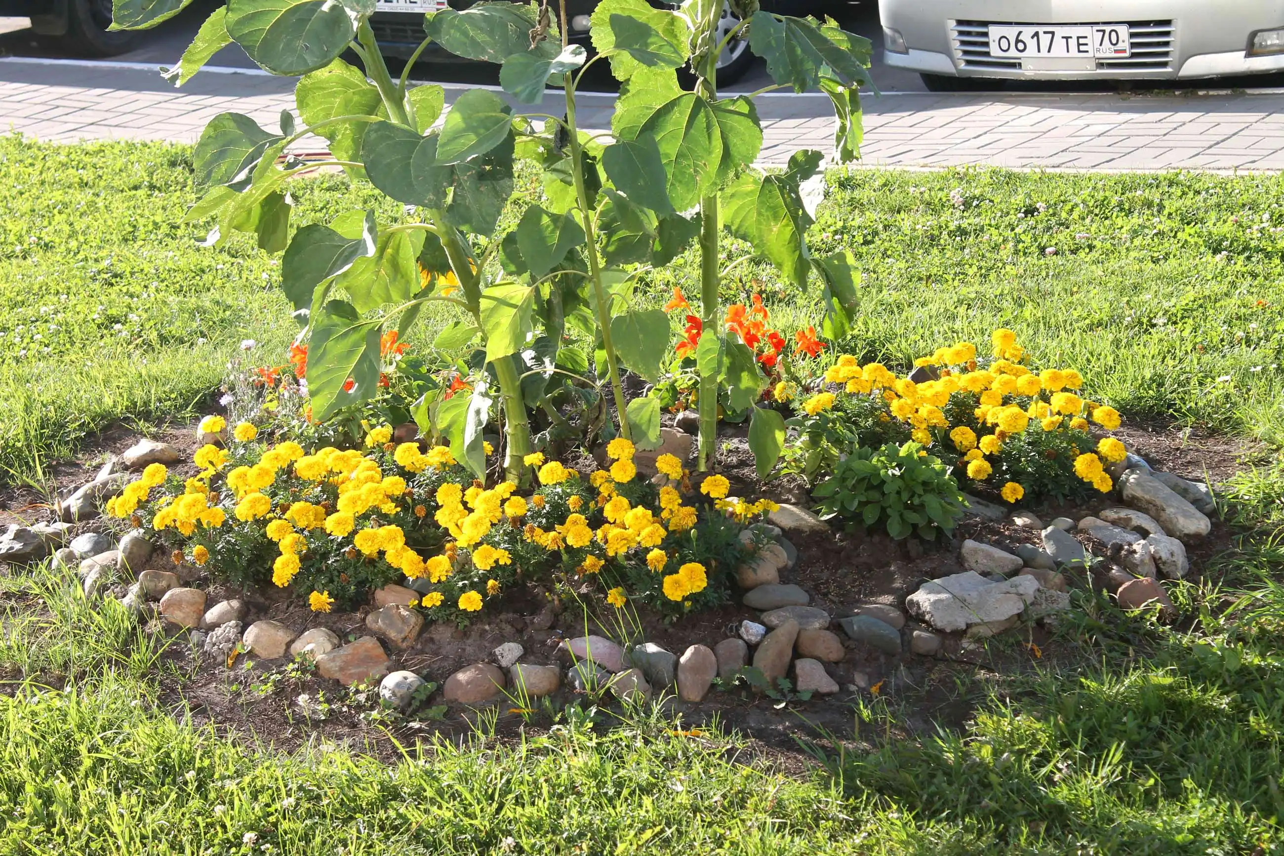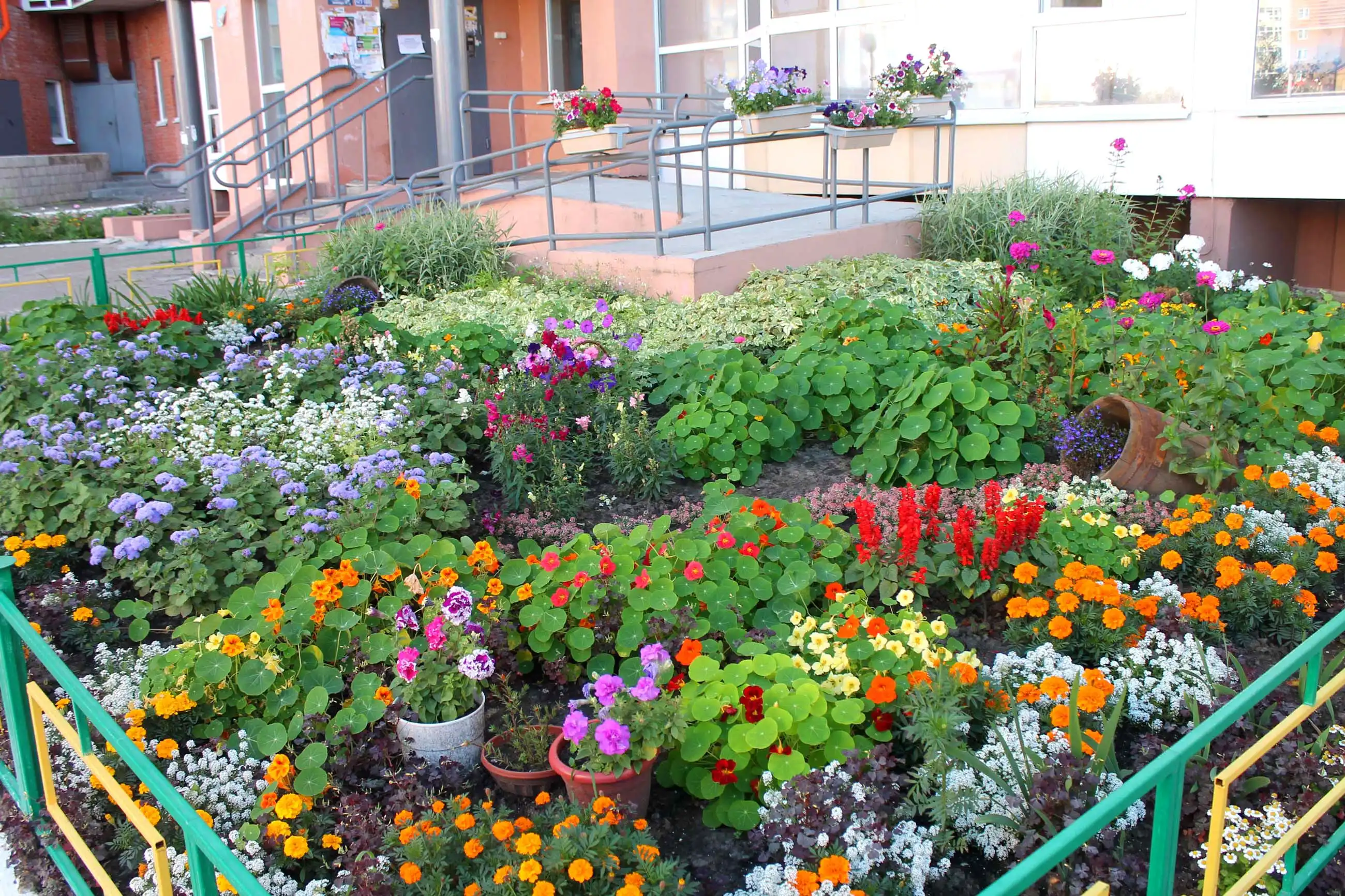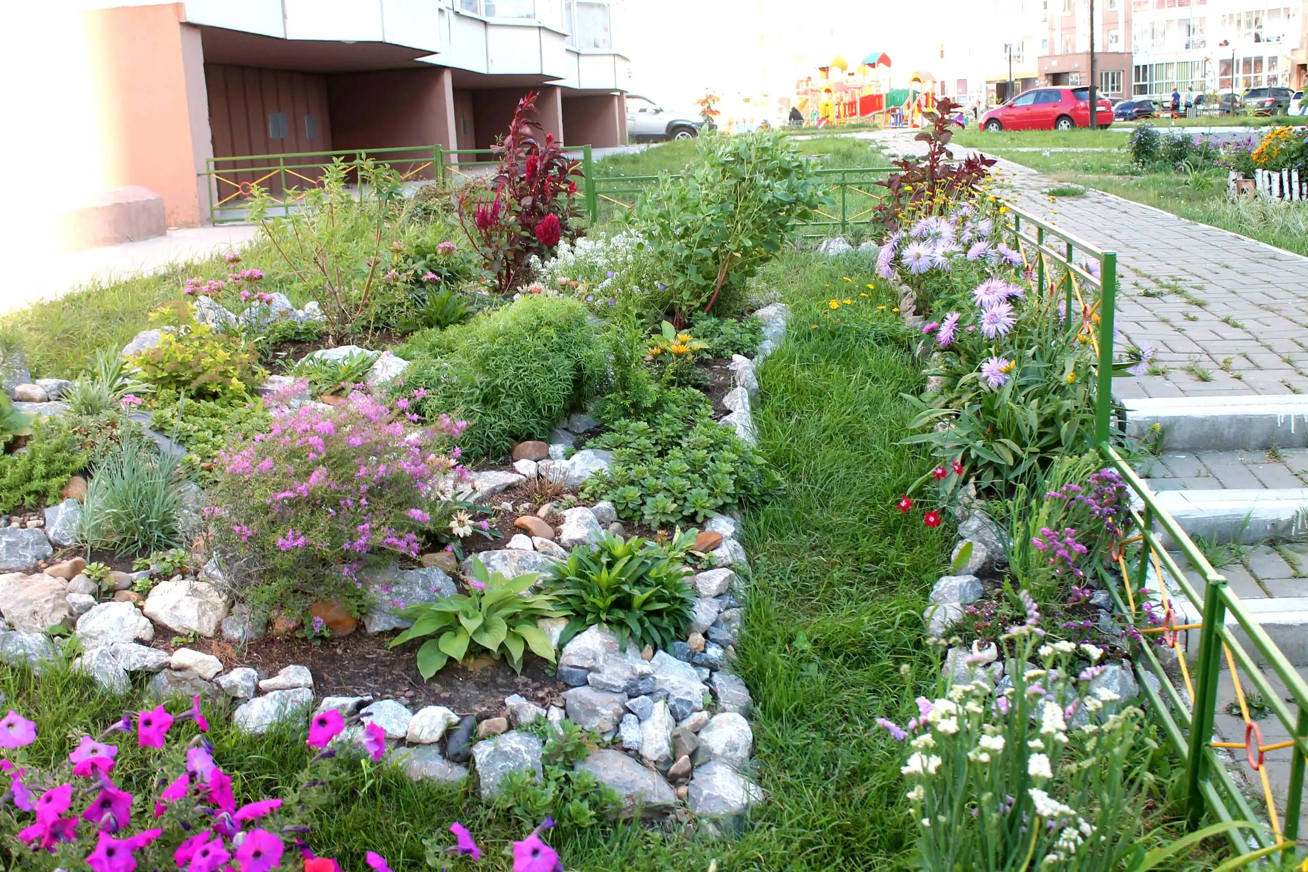 29. По всему району раскиданы различные клумбы с цветами и кустарниками. Все ухоженно и аккуратно