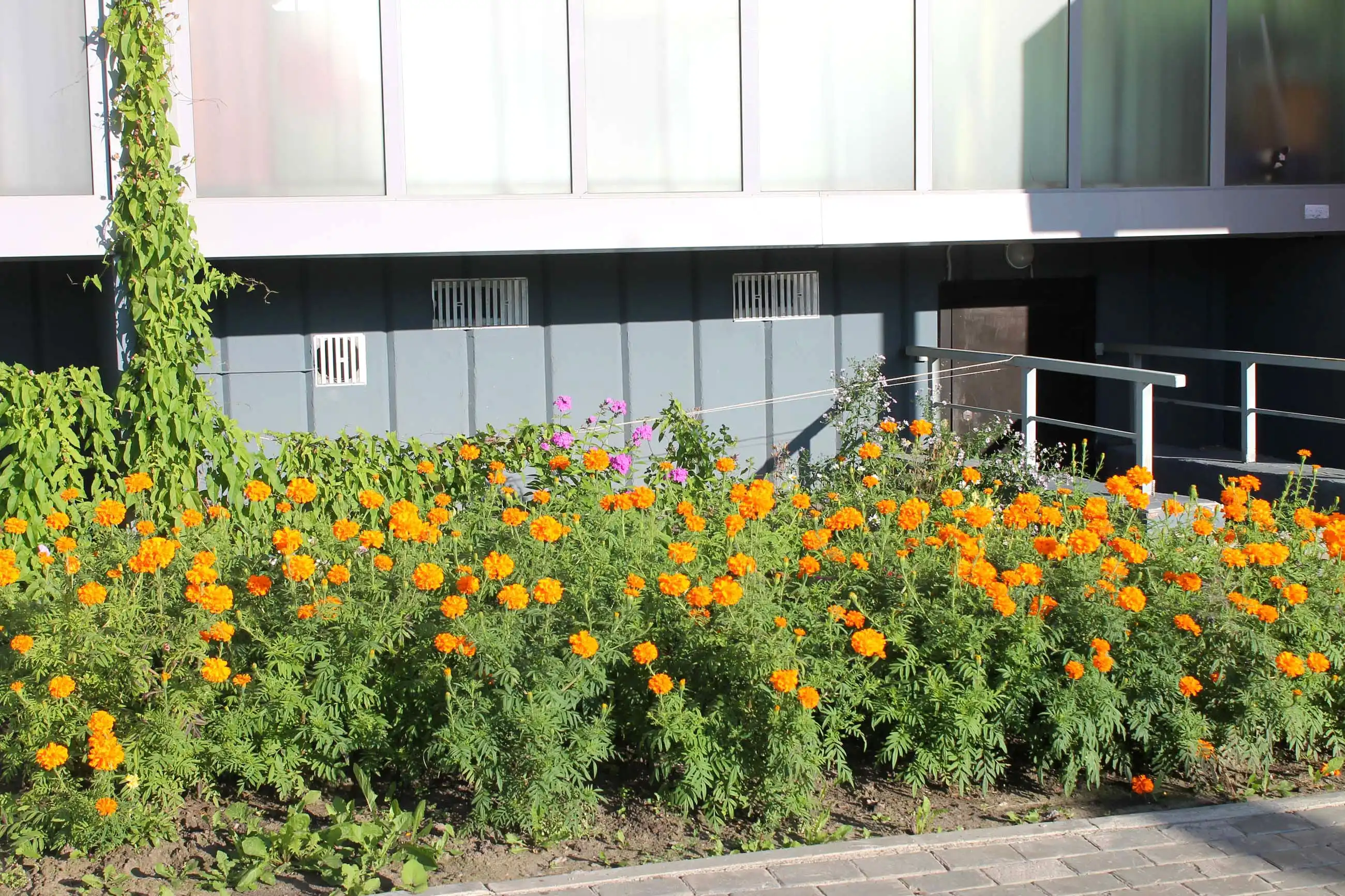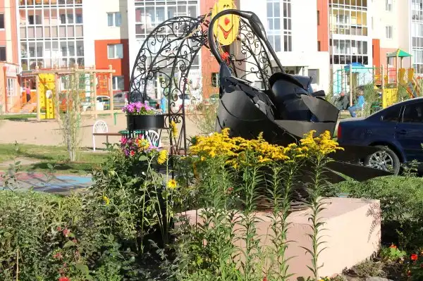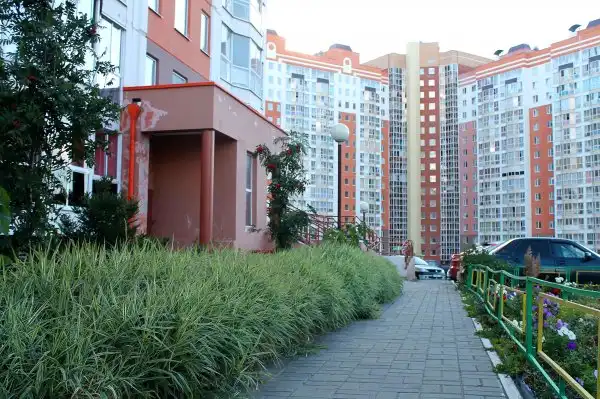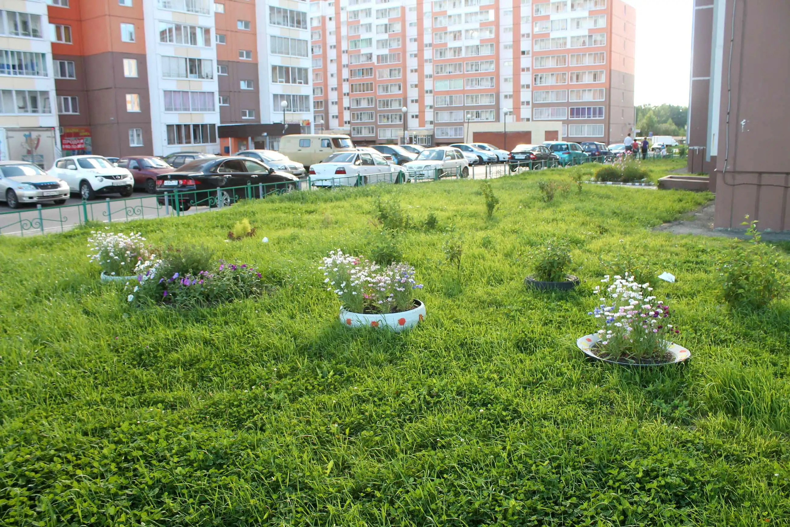 29. По всему району раскиданы различные клумбы с цветами и кустарниками. Все ухоженно и аккуратно