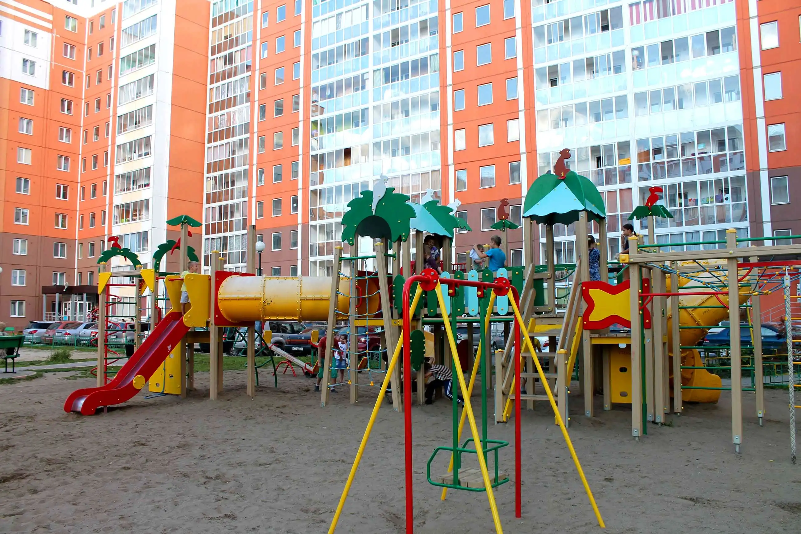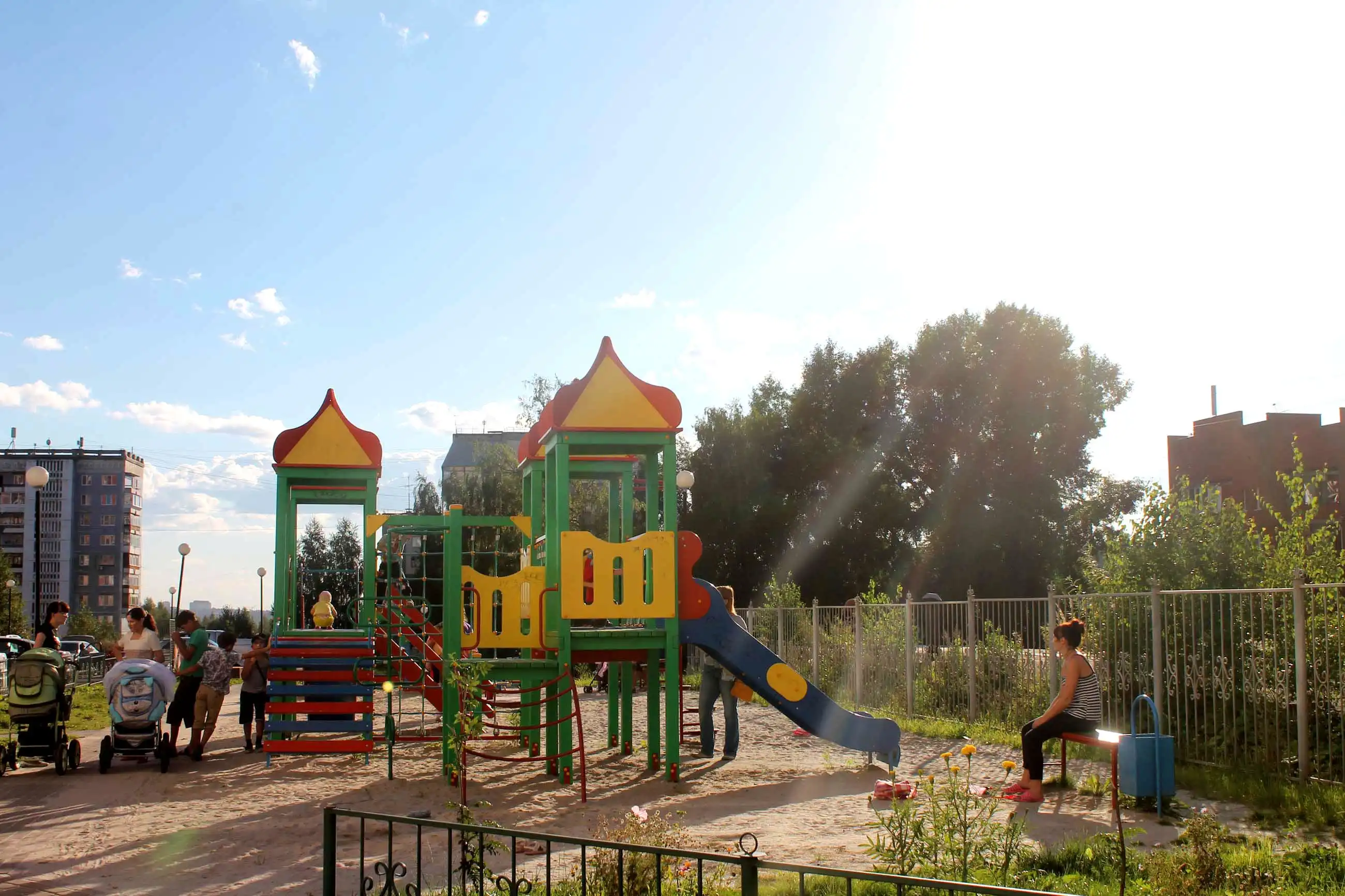 16. Детские площадки. Единственное дерево зачем-то огородили. Наверное, думают, что дети могут его сломать)