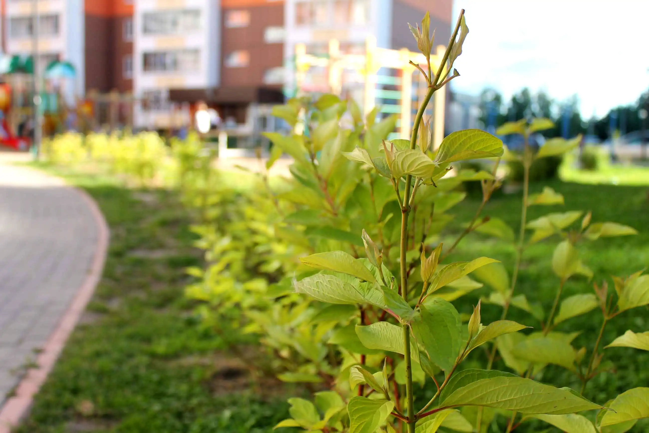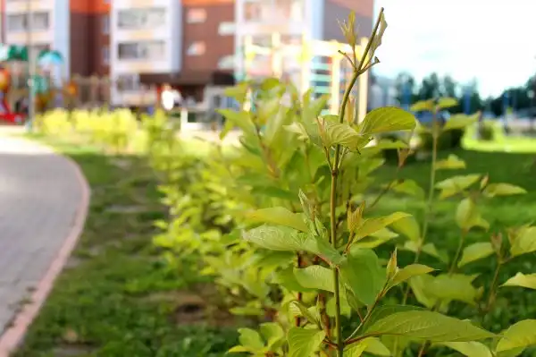 8. Деревьев, к сожалению, во всем районе очень мало. Но уже растут новые, недавно посаженные кустарники и прочие растительности