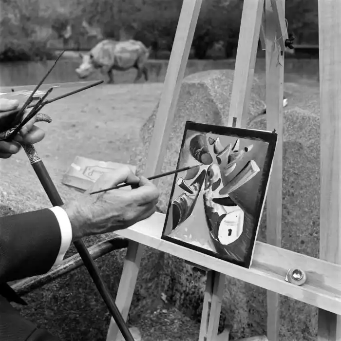 Испанский живописец Сальвадор Дали любил писать свои картины в весьма необычных местах, и именно в таком месте была написана его работа «Рога носорогов». Эта картина была написана 30 апреля 1955 года в зоопарке, где художник расположился в вольере с носорогом по кличке Франсуа. Обстоятельства, при которых творил великий художник, и вовсе поражают. На его голове стояла корочка хлеба, которую он пытался удержать всеми силами, рядом с ним лежала другая его работа «Кружевница», сам Дали сидел на тачке, а его помощники всячески дразнили носорога, чтобы тот проткнул холст своим рогом. Художник оказался очень доволен результатом, а чтобы работа была закончена до конца, он самостоятельно проткнул ее пикой, так как животное наотрез отказалось это делать.