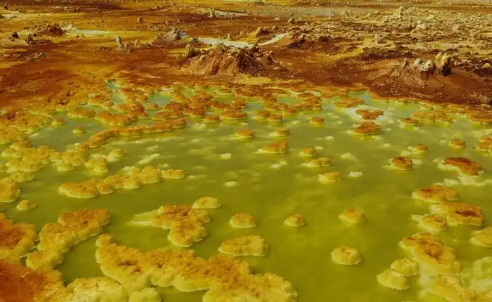 Когда-то здесь существовало поселение шахтеров, добывавших полезные ископаемые. Сейчас Даллол — город-призрак, куда не торопятся забредать даже животные. Вулканическая активность превратила это местечко в настоящий филиал ада: среднегодовая температура здесь достигает 35 градусов по Цельсию.