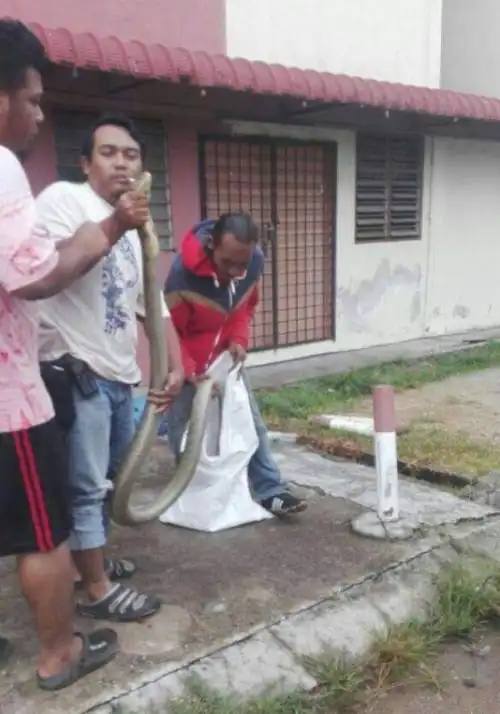 Жители Малайзии давно уже привыкли к непрошеным гостям в своих домах, поэтому, когда эта королевская кобра была замечена в одном из многоэтажных домов в штате Пинанг, жильцы не растерялись и оперативно изловили ее. Пресмыкающееся выпустили подальше от людей в его естественной среде обитания.