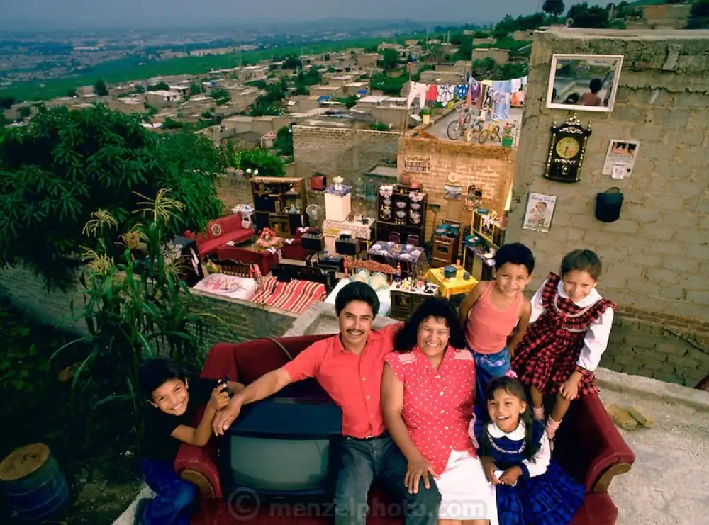 Жизнерадостная семья Кастильо Балдерас из Гвадалахары на крыше одной из дворовых построек. На заднем плане — их имущество.