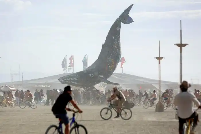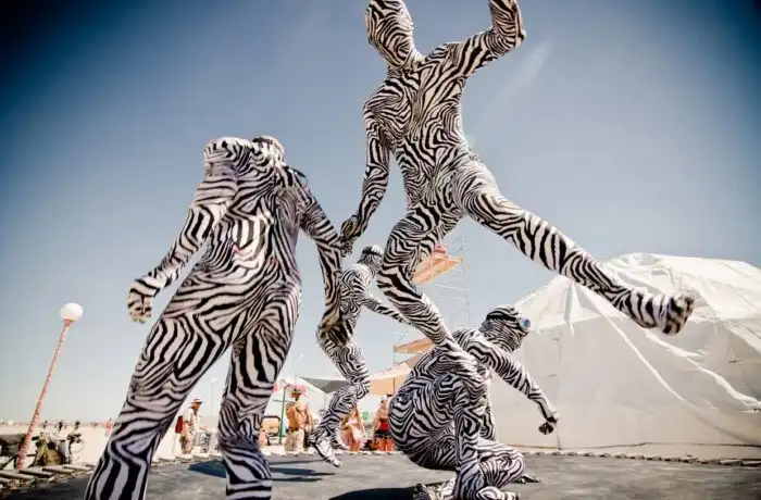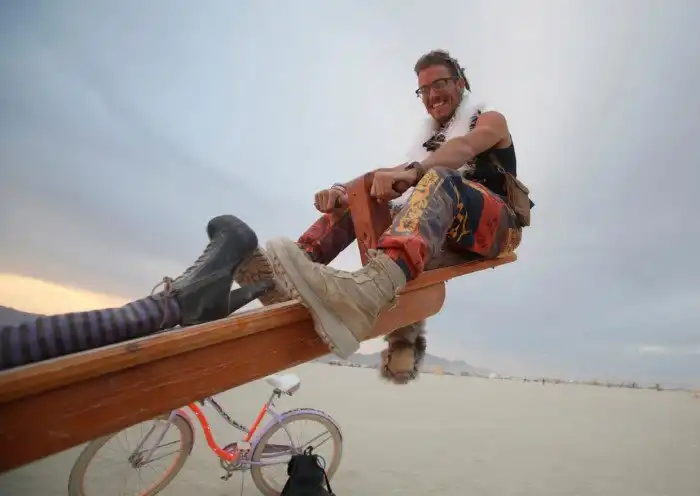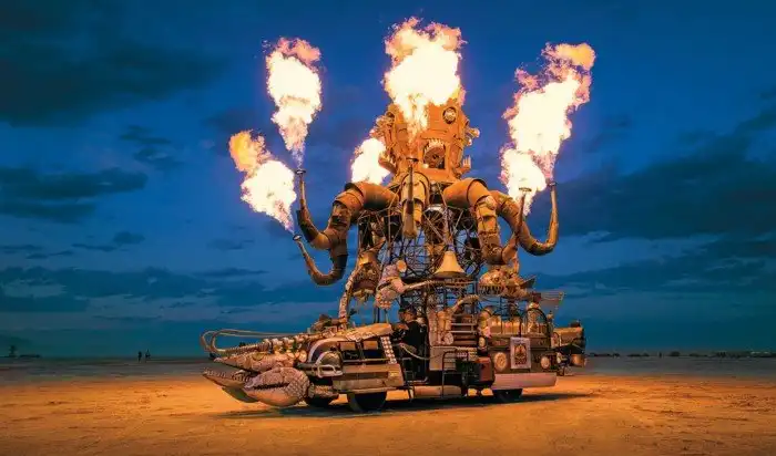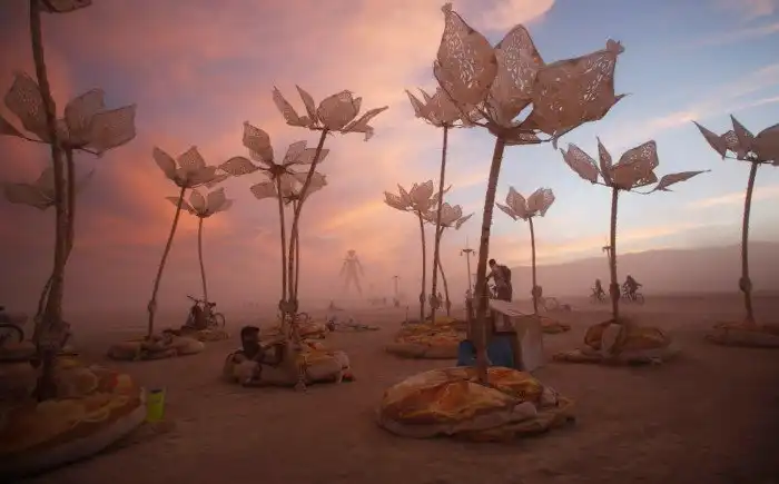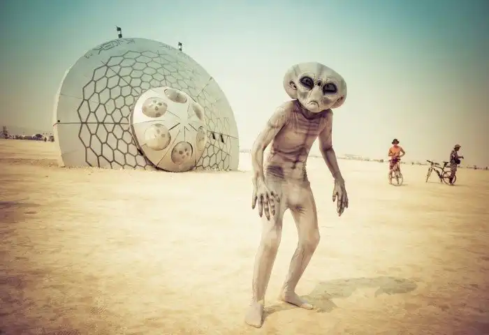 Целую неделю собравшиеся со всех концов света в пустыне люди радикально самовыражались. Посреди песков были возведены различные необычные сооружения и инсталляции, часто фантастических форм. Здесь можно встретить сотни машин самого невероятного вида, многие участники ходят в костюмах персонажей зверей и различных предметов.