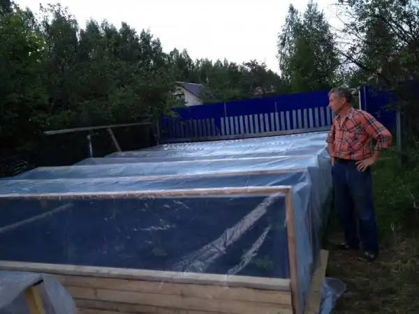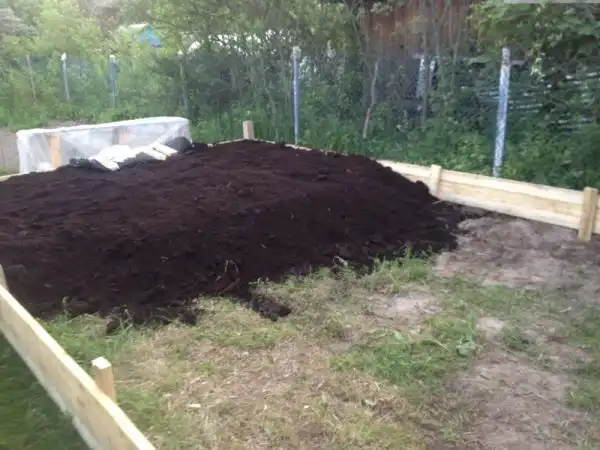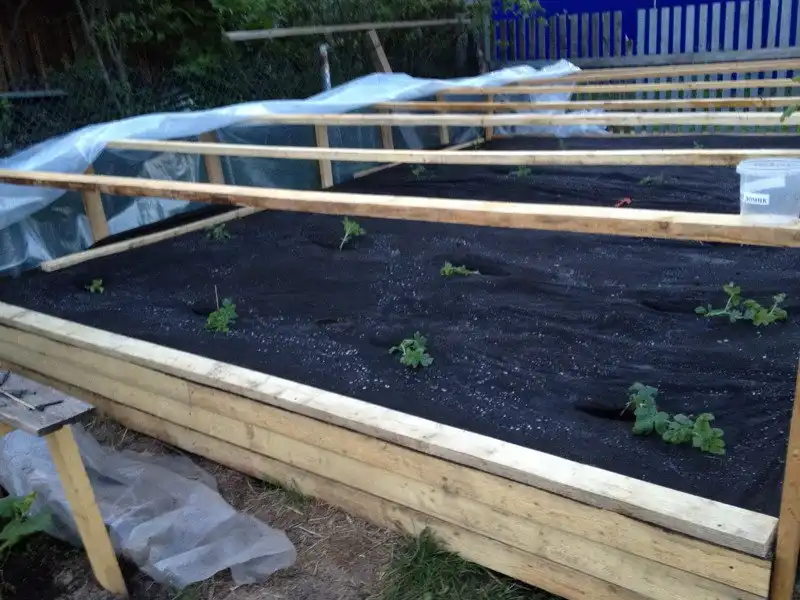 Выращивание я производил на высокой грядке в 30 см, ну конструкция очевидна, доски, торф в коробе и поверх изоспан.