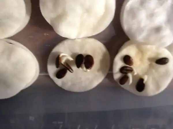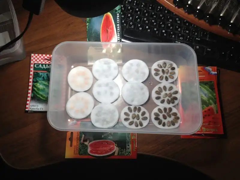 Берется ватный диск, смачивается водой, укладываются семена и закрываются таким же ватным диском