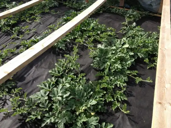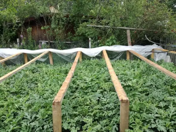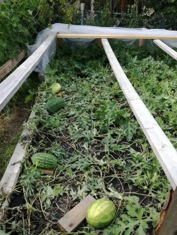 Над самой бахчей, как видите легкий досчатый каркас под пленку, что бы укрывать от заморозков и холодных ночей,