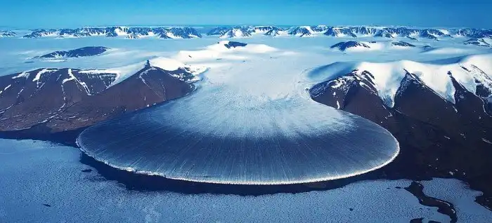 Арктический Ледник Нога слона найден в северной Гренландии. Серая зона в низком возвышении на леднике выгравирована каналами талой воды, ясно отделенными от белой поверхностной зоны накопления выше. Нетрудно понять, откуда у этого ледника появилось такое название. Этот уникальный ледник расположен в удивительном географическом положении на северо-восточном побережье Гренландии