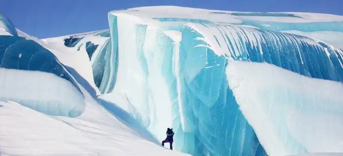 Эта уникальная замороженная волна расположена в Антарктиде. Она была обнаружена американским ученым Тони Трэвоуиллоном в 2007. Эти фотографии на самом деле не показывают гигантскую волну, так или иначе замороженную в процессе. Формирование содержит синий лед, и это — убедительное свидетельство, что оно не было создано мгновенно из волны. Синий лед создается путем сжатия пойманных в ловушку воздушных пузырей. Лед выглядит синим, потому что, когда свет проходит через слои, синий свет отражается назад, а красный свет поглощается. Таким образом, темно-синий цвет предполагает, что лед формировался медленно в течение долгого времени, а не мгновенно. Последующее таяние и перезамораживание за многие сезоны дали формированию гладкую, подобную волне внешность.