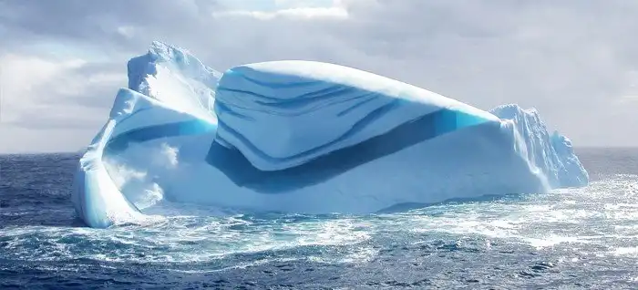 Чаще всего айсберги имеют синие и зеленые полосы, но могут быть коричневыми. Это явление часто происходит в южном Океане. Полосатые айсберги с многократными цветными полосами, включая желтый, коричневый цвет, довольно распространены в холодных водах по Антарктиде. Цветные айсберги сформированы, когда большие куски льда отрываются от шельфового ледника и попадают в море. Поскольку ледники составлены из снега, падающего на Антарктиду в течение многих тысячелетий, лед составлен из пресной воды. Таким образом оказывается, что плавающий свежий лед взаимодействует с соленой водой. Морская вода находится в контакте с переохлажденным ледником, также замораживается, как будто покрывая его коркой. Этот верхний слой льда, сформированного из морской воды, содержит органические вещества и полезные ископаемые. Подхваченные волнами и унесенные ветром, айсберги могут быть окрашены удивительными цветными полосами различных форм и структур. Айсберг кажется белым из-за крошечных пузырей, пойманных в ловушку во льду и рассеянного света. Синие участки созданы, когда трещина в ледяном щите заполняется талой водой, которая быстро замораживается. В этом случае у пузырей нет времени, чтобы сформироваться. Когда вода богата морскими водорослями, полоса может быть окрашена в зеленый, а также в другой оттенок.