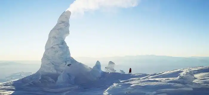 Сотни ледяных башен можно увидеть на вершине вулкана Эребус (3.800 м). Они выглядят, словно однодневная щетина на лице гиганта. Постоянно действующий вулкан, возможно, единственное место в Антарктиде, где огонь и лед встречаются, смешиваются и создают что-то уникальное. Башни могут достигать 20 метров высотой и выглядеть почти живыми, выпуская струи пара в южное полярное небо. Часть вулканического пара замораживается, откладываясь на внутреннюю часть башен, расширяясь и расширяя их.