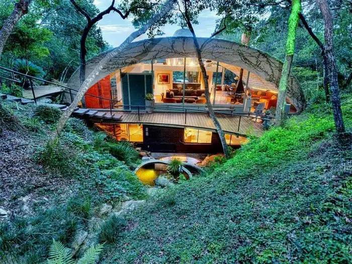 Благодаря стеклянным стенам и куполообразной крыше этот дом гармонично сочетается с лесным пейзажем в пригороде Остина.