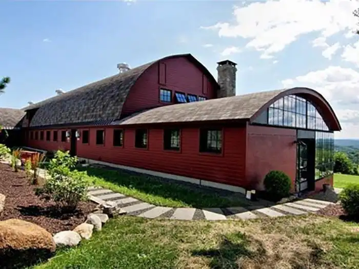 Этот дом, напоминающий амбар-переросток, возвышается посреди земельного участка площадью 18 гектаров на просторах Новой Англии. После недавнего обновления он получил тёплые полы и оригинальные деревянные окна.