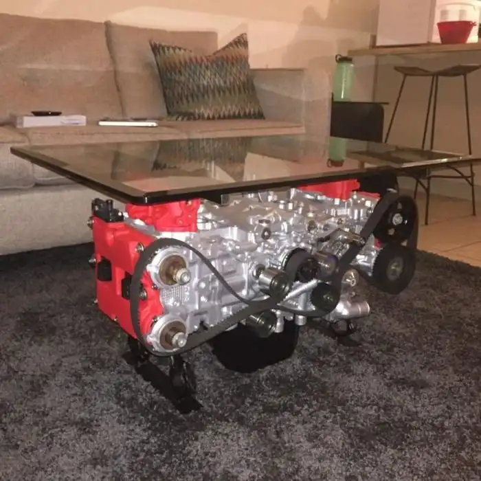 Попав в серьезную аварию на своем любимом автомобиле, парень решил сохранить в память о нем его «железное сердце». Двигатель машины превратился в оригинальный журнальный столик, который стал весьма необычным украшением интерьера. Самое интересное, что мотор сохранил свою работоспособность и при случае его можно завести прямо в комнате.