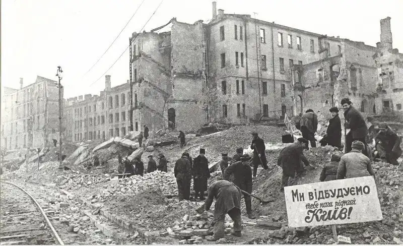 На щите надпись «Мы возродим тебя наш роднои Киев!», 1944 год.