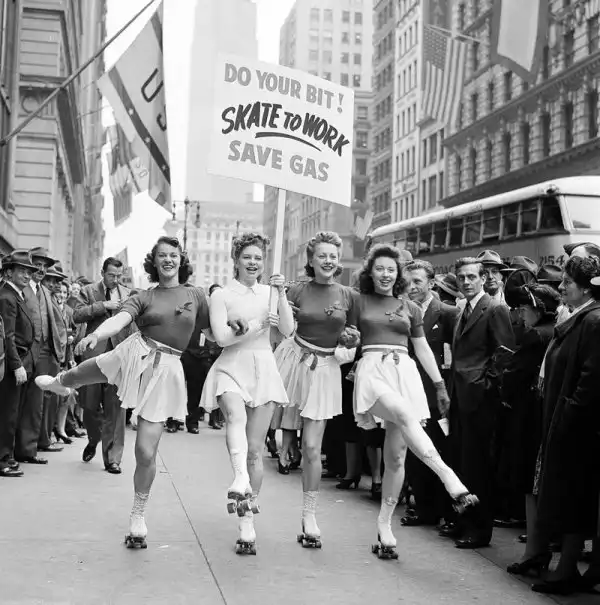 Внеси свою лепту в экономию бензина. Добирайся на работу на роликах. США, 1940 год.