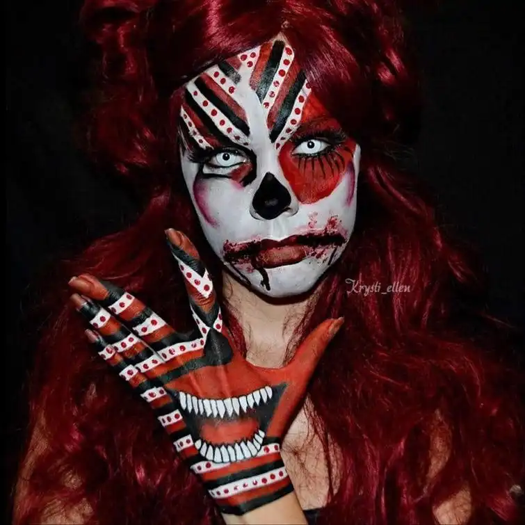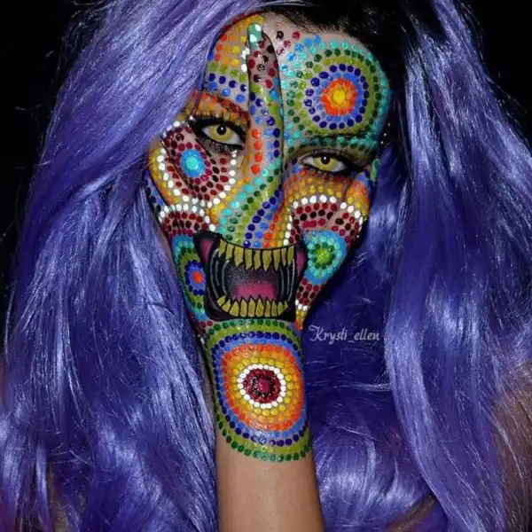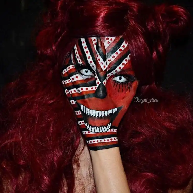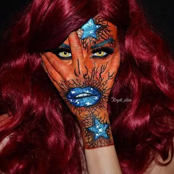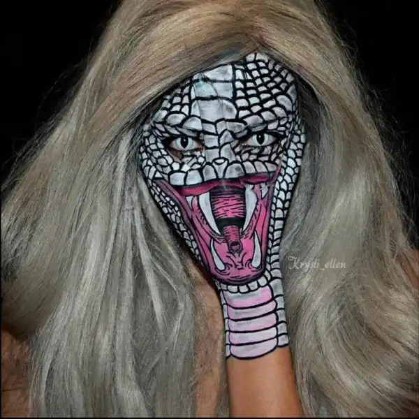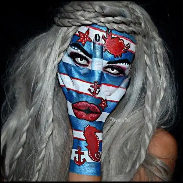Мы уже было подумали, что в бодиарте нельзя придумать ничего нового, но косметолог из Денвера Кристи Эллен (Krysti Ellen) доказала нам обратное. Будучи самоучкой в области бодиарта Кристи придумала, как создавать жуткий бодиарт используя свою руку в качестве маски. Она разрисовывает лицо, разрисовывает руку, а потом объединяет их вместе, чтобы могли увидеть полную картину её творения. Поначалу многие из вас могут даже не заметить руку, потому что вся эта композиция смотрится со стороны просто идеально. "Как, чёрт возьми, она это делает?", спросите вы, видео создания макияжа прилагается.